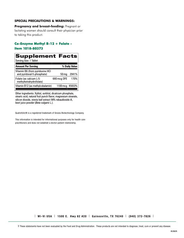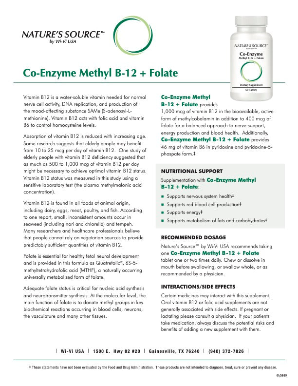 Co-Enzyme Methyl B-12 + Folate provides 1,000 mcg of vitamin B12 in the bioavailable, active form of methylcobalamin in addition to 400 mcg of folate for a balanced approach to nerve support, energy production and blood health. Additionally, Co-Enzyme Methyl B-12 + Folate provides 46 mg of vitamin B6 in pyridoxine and the activated pyridoxine-5-phospate form.‡