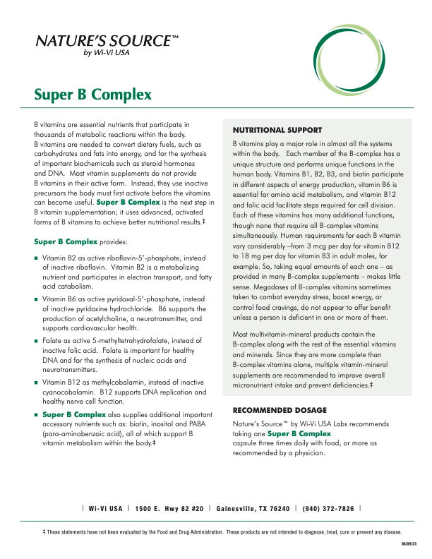 Introducing Nature's Source Super B Complex, a comprehensive blend of essential B vitamins meticulously crafted to support your overall health and vitality. Packed with a powerhouse of nutrients including thiamin, riboflavin, niacin, vitamin B6, folate, vitamin B-12, biotin, pantothenic acid, choline, inositol, PABA, and intrinsic factor, this formula is designed to deliver a multitude of benefits for your body and mind.