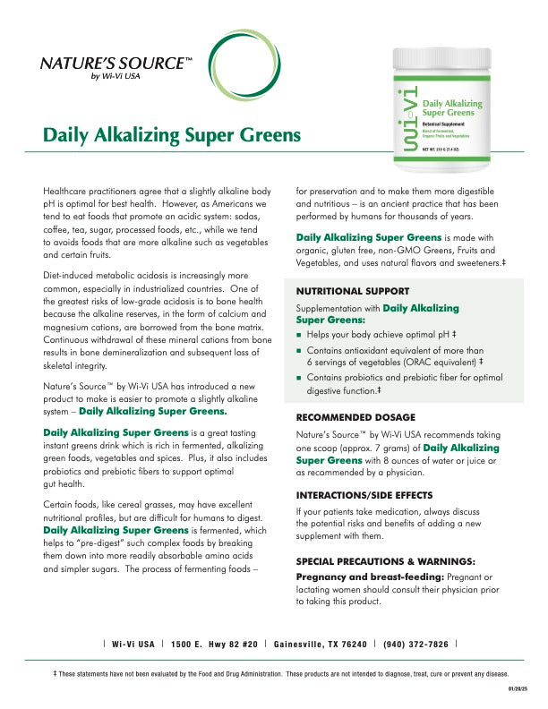Alkalizing Super Greens Blend is fermented, which helps to “pre-digest” complex foods by breaking them down into more readily absorbable amino acids and simpler sugars.